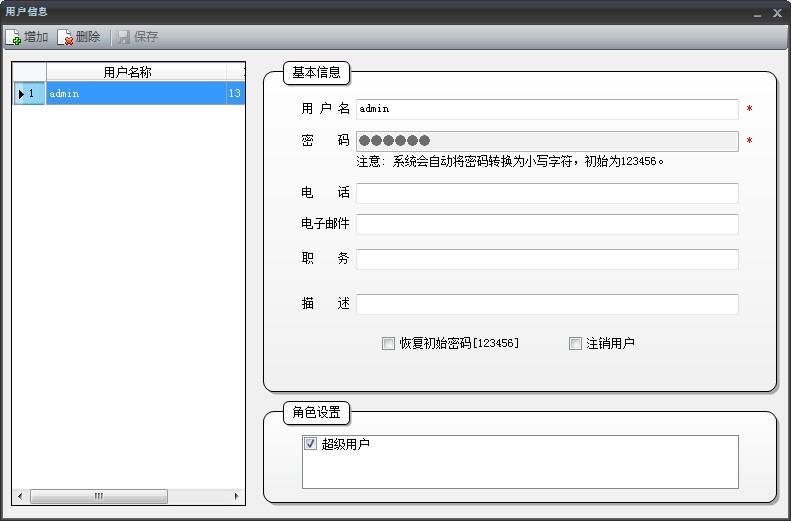 l 增加用戶(hù):點(diǎn)擊“增加”按鈕,輸入用戶(hù)名、密碼、電話(huà)等信息,點(diǎn)擊“保存”按鈕。