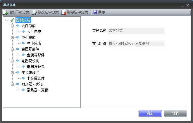 在器材分類(lèi)中,每個(gè)分類(lèi)包括類(lèi)別名稱(chēng)、前綴符,可按需進(jìn)行增加、修改、刪除。