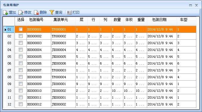 包裝箱的界面如下,可按需進(jìn)行增加、修改、刪除、查詢(xún)、打印。
