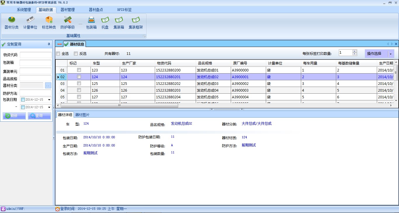 查詢(xún)條件有:物資代碼、包裝箱、集裝單元、品名規(guī)格、器材分類(lèi)、防護(hù)方法、包裝日期。