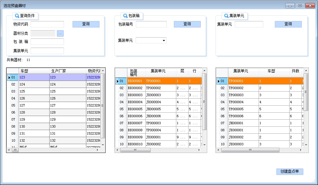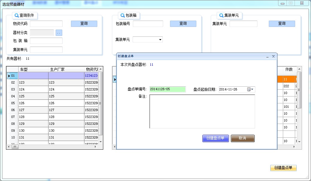 l 注意:創(chuàng)建盤(pán)點(diǎn)單時(shí)務(wù)必有器材的信息、包裝箱、集裝單元的信息。
