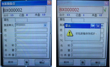 l 用戶(hù)拿著手持點(diǎn)擊“開(kāi)始”按鈕,即可對(duì)包裝箱上的RFID標(biāo)簽進(jìn)行識(shí)讀,正常情況下只能識(shí)讀到一個(gè)標(biāo)簽(若兩個(gè)標(biāo)簽距離太近也有可能識(shí)讀到旁邊的)。識(shí)讀到標(biāo)簽后點(diǎn)擊標(biāo)簽號(hào),然后點(diǎn)界面右下角“選擇”按鈕,即可進(jìn)入此包裝箱的詳細(xì)信息界面,如下左圖,然后點(diǎn)擊界面右下角“確定”按鈕,點(diǎn)擊提示框上“ok”按鈕即可。
