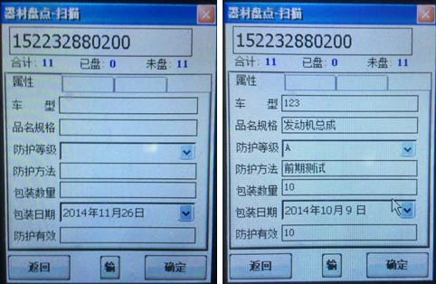 l 掃描器材上的二維碼之后出現(xiàn)如下第一張圖,會(huì)將物資代碼識(shí)讀到上面的輸入框中,然后按下手持鍵盤(pán)左上角的“ok”鍵,會(huì)出現(xiàn)器材的詳細(xì)信息,如下第二張圖點(diǎn)擊界面右下角“確定”按鈕,點(diǎn)擊提示框上的“ok”按鈕保存即可。