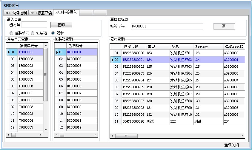 根據(jù)需要查詢(xún)出要寫(xiě)入的集裝單元、包裝箱或器材的標(biāo)簽號(hào),然后點(diǎn)擊要寫(xiě)的某一個(gè),右上方標(biāo)簽字符后面的輸入框中會(huì)提取所點(diǎn)擊的集裝單元號(hào)、包裝箱號(hào)或物資代碼,此時(shí)點(diǎn)擊寫(xiě)即可將標(biāo)簽號(hào)寫(xiě)入到RFID標(biāo)簽中。